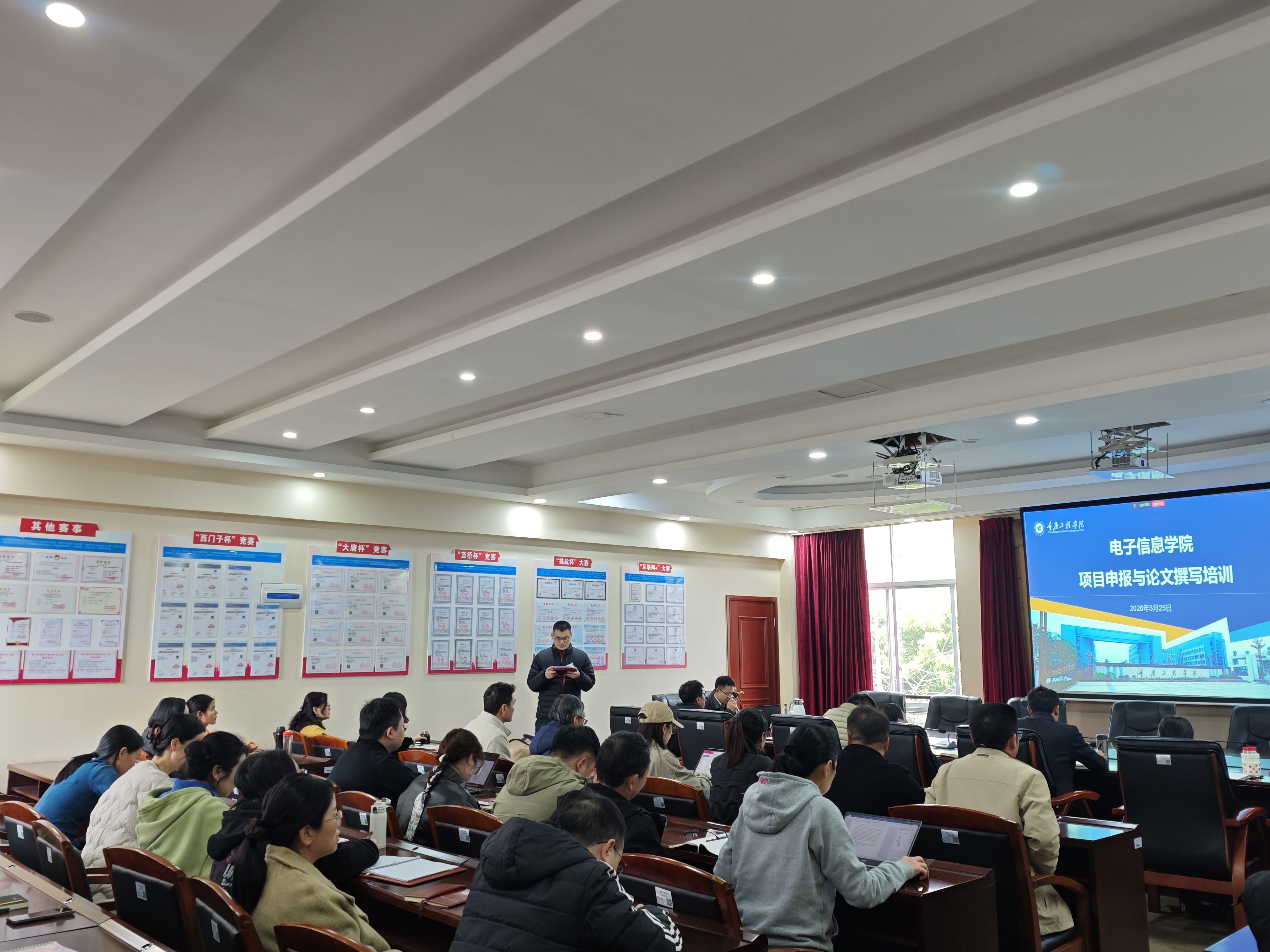 2026 年 3 月 25 日下午,电子信息学院在 212 会议室举办科研项目与学术论文撰写专题讲座,特邀重庆工商大学秦华锋教授担任主讲。学院全体教职工参会,双桥校区教师线上同步聆听。讲座由副院长张仁永主持。