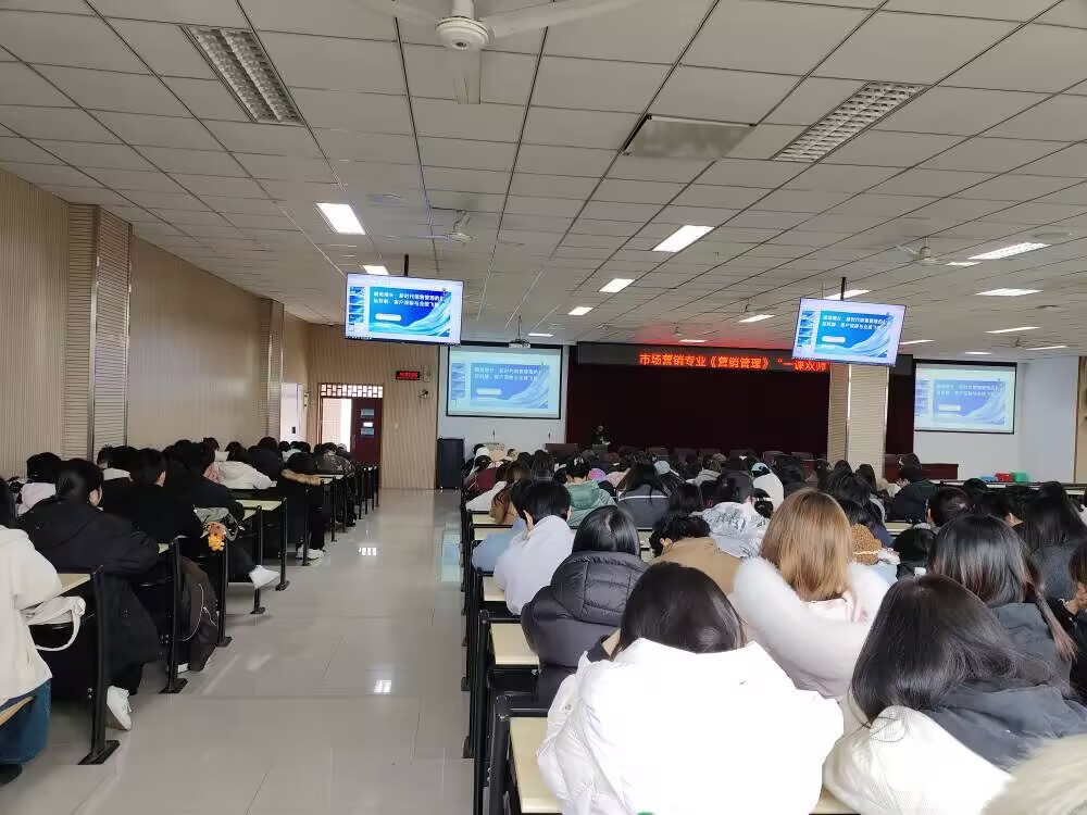 本网讯(文/图 王渝)2025年12月10日下午,我院在6302报告厅举办了市场营销专业《销售管理》一课双师专题讲座。本次讲座特邀重庆鑫榜科技有限公司总经理余迁担任主讲人,市场营销专业2023级全体学生参加。数字营销系教师、《销售管理》课程负责人王渝博士出席并致欢迎辞。