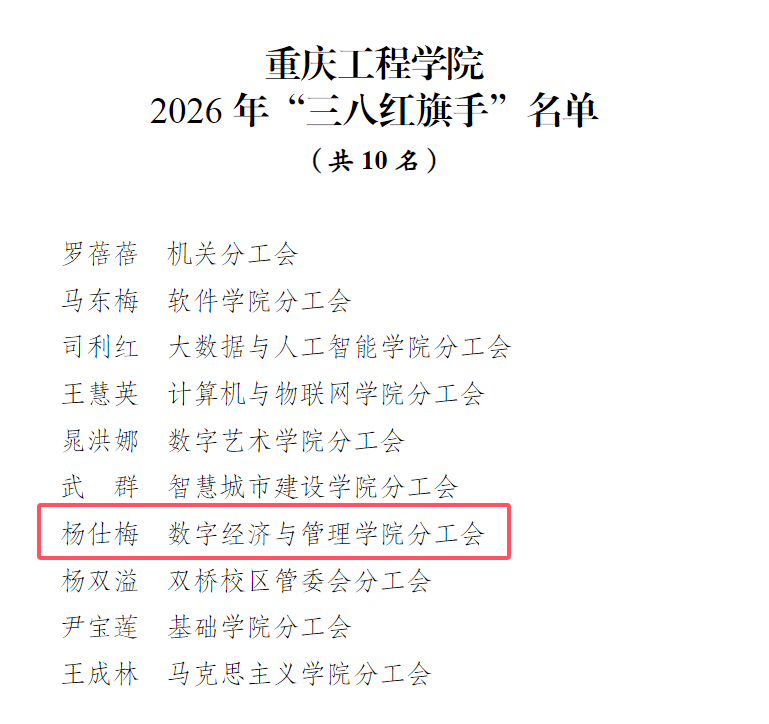 本网讯(图/文 章鑫 学生党教中心)近日,重庆工程学院正式公布2026年“三八红旗手”评选结果,全校共10名优秀教职工获此荣誉。其中,我院分工会的杨仕梅老师凭借突出的工作成果,成功入选名单,成为学院女职工队伍的杰出代表。