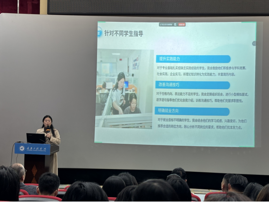 随后,辅导员杨丽颖结合带班实践,以“四维发力,精准施策”为主题分享了工作经验。实习与就业指导老师彭敏则以“以心引路,以行护航”为题,介绍了针对学生个性化需求的指导实践。