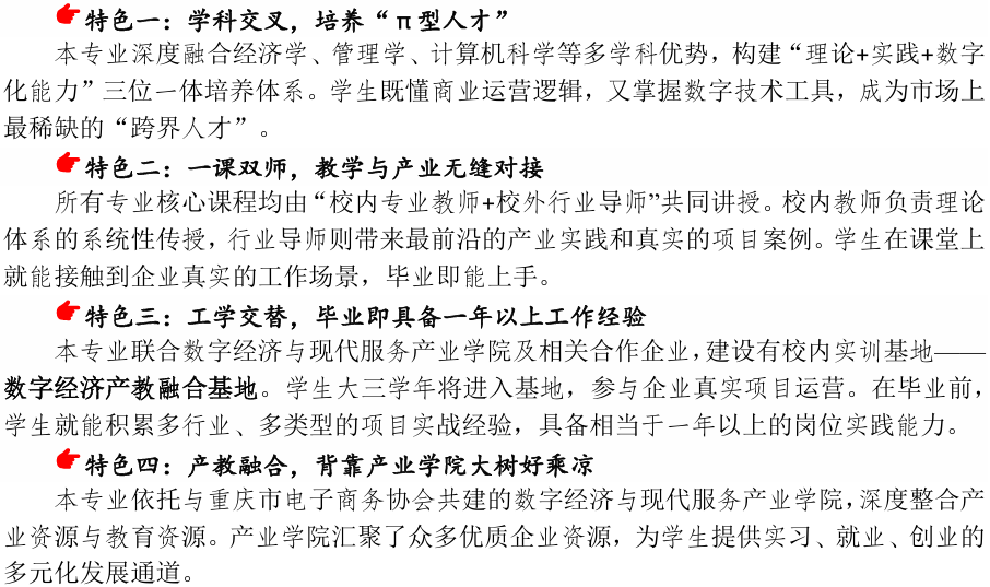 数字经济是融合经济学、管理学、计算机科学等多学科的新兴专业,紧扣“数字中国”与“数字重庆”发展战略,深度融合区域经济社会发展。本专业深入落实学校“1234”应用型人才培养体系建设、深度推进“2.5+1+0.5”应用型人才培养秉持“学科交叉、理实并重、数智赋能”的培养理念,依托学院多年的人才培养积淀和紧密校企合作,构建了涵盖“一课双师”以项目为主线的数字经济模块化专业能力培养”“以学生为中心的数字经济分项目/分岗位轮训”三大“校企合作、产教融合”专业实践能力培养体系。通过“专业理论案例教学”“专业实训项目制教学”“校内商业化项目实习基地工学交替'式岗位制教学”模式,将企业真实案例融入理论教学、真实项目融入专业实训、真实岗位融入专业实习,有效实现学生专业知识与实践能力的协同提升,致力于培养以经济学理论为基础、以数字技术为手段、以产业应用为导向“懂数据、通经济、善应用、能创新”的高素质应用型数字经济人才