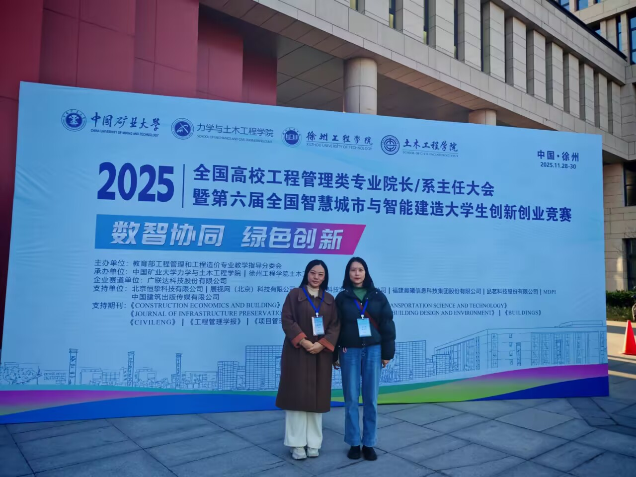 本网讯(文/图 智慧城市建设学院 曾赟) 11月28日-30日,全国高校工程管理类专业院长/系主任大会在江苏徐州中国矿业大学召开,智慧城市建设学院工程管理系主任安雪玮、副主任曾赟应邀参会,深入学习工程管理系行业前沿动态,为学校相关专业转型与高质量发展积累关键经验。