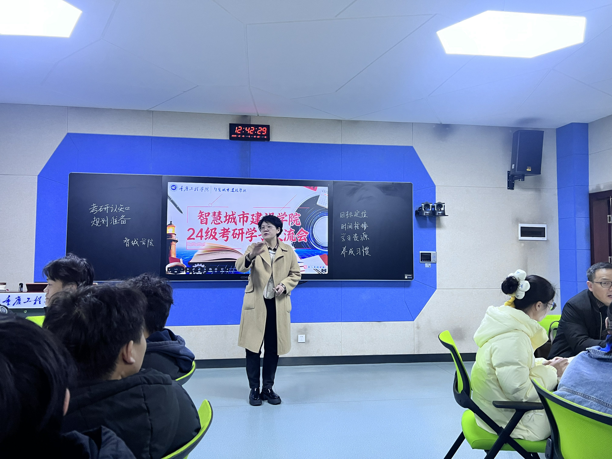 本网讯(文/图 刘洋 张徐宇) 为帮助2024级本科生科学规划学业发展路径、提前了解考研形势与政策,智慧城市建设学院于12月19日组织召开考研座谈会。院长雷江、书记唐和平、副院长李颖等学院领导及各科室负责人和2024级有意向考研的学生齐聚于学校图书馆智慧教室,围绕考研动机、备考策略、专业选择等话题展开深入交流。