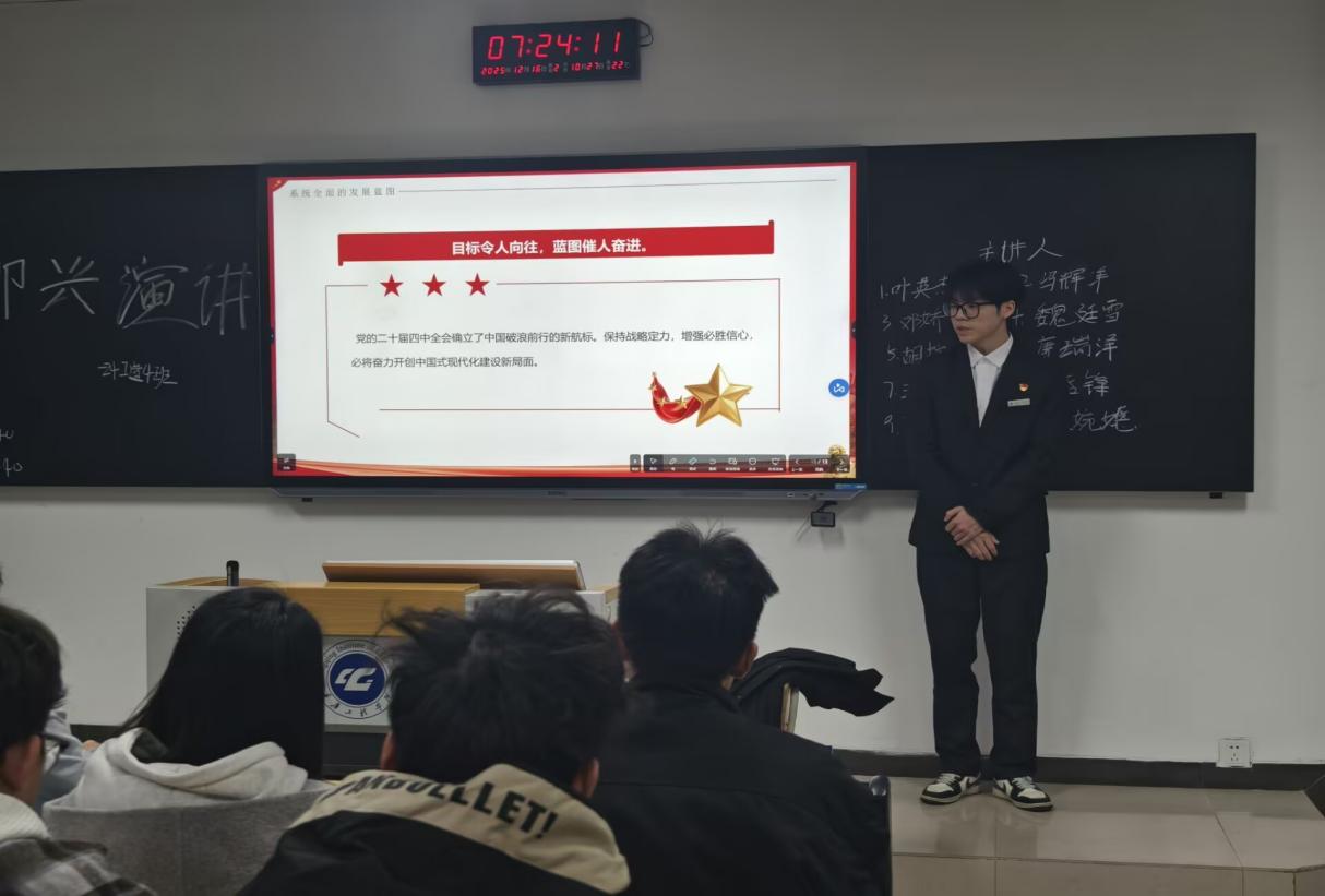 本网讯(文/范烨坪 图/陈万菊) 为深植低年级学生红色基因,深化“早启蒙、早教育、早衔接”党建培育体系,推动党的二十届四中全会精神入脑入心,12月16日,智慧城市建设学院学生党员实践教育中心以晨课宣讲为载体,开展“党的二十届四中全会擘画发展蓝图”主题宣讲活动,引导低年级学生领会全会精神内核,明晰发展方向,坚定向党组织靠拢的信念。