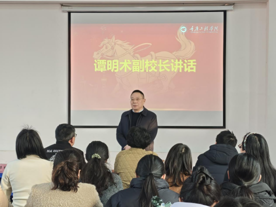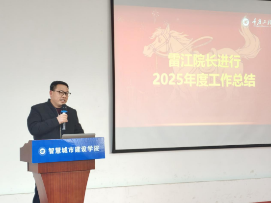 在总结表彰环节,院长雷江首先宣读了学院关于表彰优秀个人的决定,并邀请谭明术副校长为受表彰个人颁发证书,随后2名优秀代表依次发言。接着,雷江对学院2025年工作展开总结,重点回顾了教学、科研、师资队伍建设、校企合作协同育人、学生教育、招生就业、党建品牌、宣传等方面的工作,既肯定了成绩,也指出了不足,尤其围绕存在的问题深入剖析原因、明确改进方向,并着重强调了2026年的工作要点。