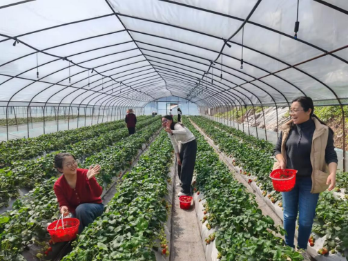 下午14时许,大家抵达位于巴南区南彭街道的草莓基地。踏入温暖的草莓大棚,清新果香扑面而来,一垄垄翠绿的植株间,鲜红饱满的草莓点缀其间,煞是喜人。在听取工作人员关于采摘技巧和注意事项的简要介绍后,大家便提着小篮兴致勃勃地投入田园怀抱。她们一边弯腰采摘,一边交流心得,欢声笑语在田垄间流淌。经过一小时的快乐劳作,每个人都收获了满满一篮的“甜蜜果实”。