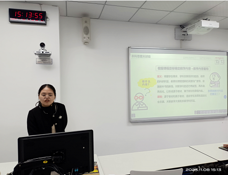 在系部讨论的基础上,各系部推荐一名代表在学院进行了主题交流发言。王慧英老师以“基于OBE理念的有效教学”为主题,提出有效教学应达到有效益、有效果、有效率,最终实现目标与行动的一致性、行动与效果的一致性、效果与目标的一致性的有效教学。