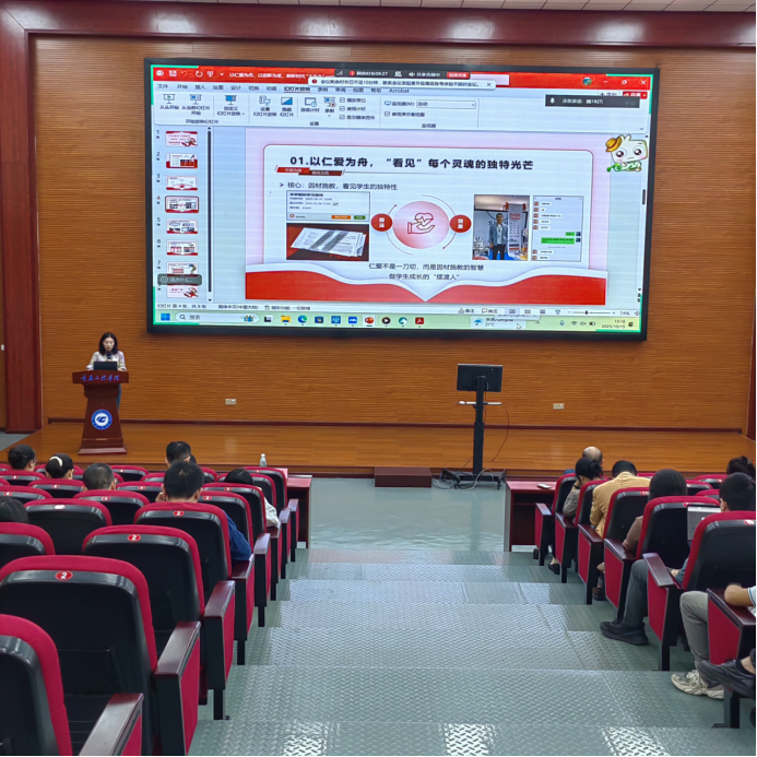 视频学习结束后,秦旗老师结合自身教育教学经验,作《以仁爱为舟,以创新为浆,做时代“大先生”》的主题宣讲,深刻阐述了教育家的三重境界,把以仁爱为舟、以创新为桨、以使命为舵作为出发点,把“看见”每个灵魂的独特光芒、点燃学生内在的求知火焰、锚定“国之大者”的育人方向作为落脚点,讲述了从三尺讲台走向“大先生”的境界的实践路径。