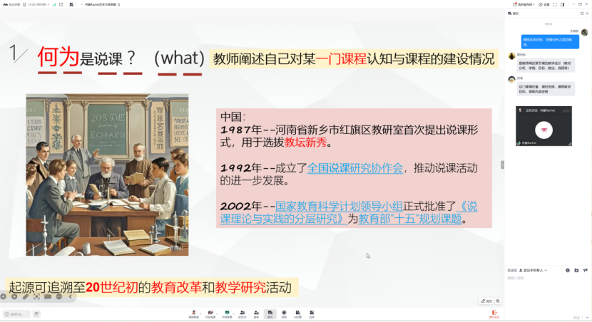 在本次培训中,何睿老师首先抛出问题“说课要包含哪些内容”,引导新老师们在线上进行探讨和交流,从而引出“什么是说课”这一内容。
