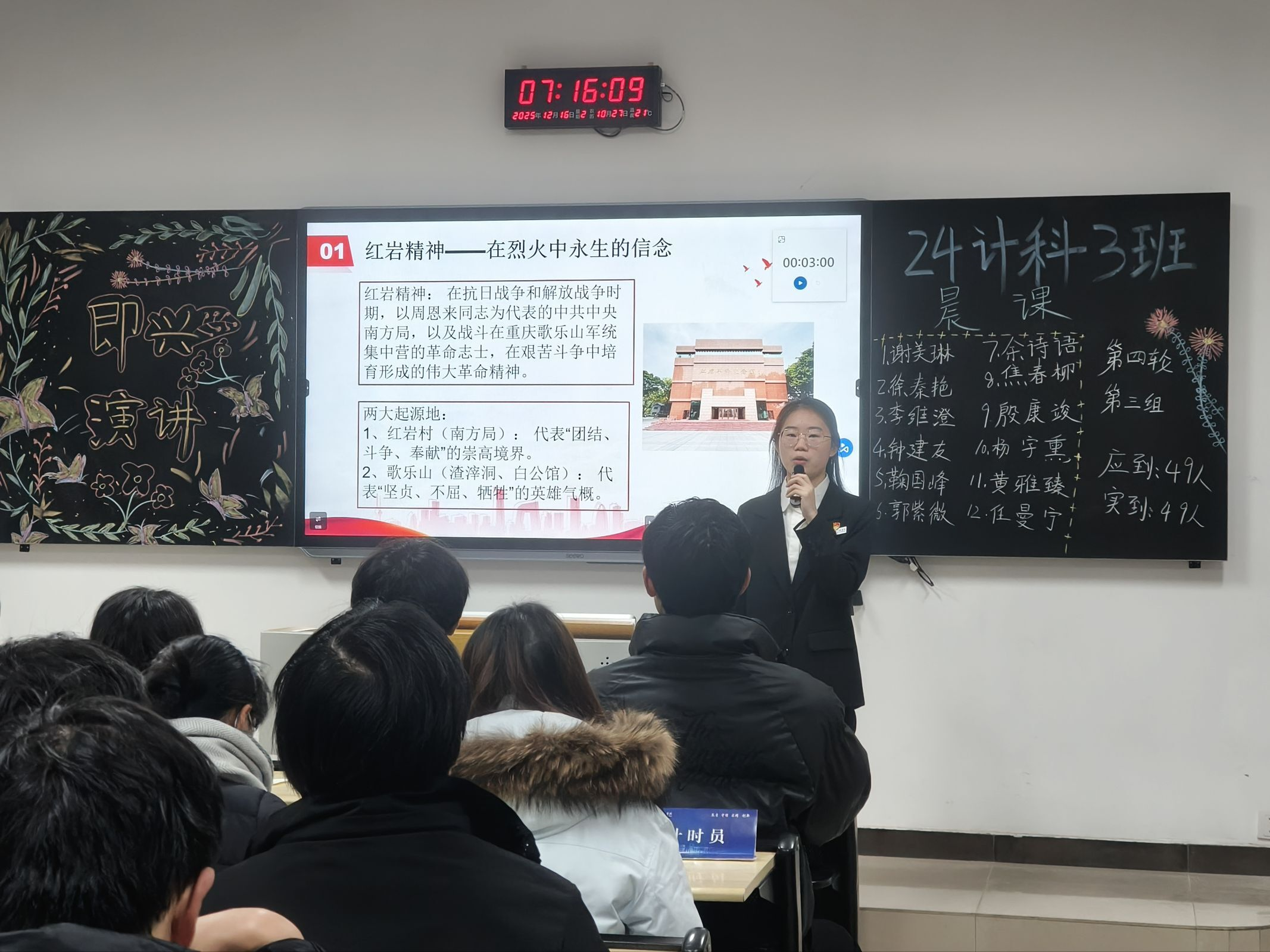 本网讯(图/文 魏登雪)为充分发挥学生党员的先锋模范作用,夯实青年学子的理想信念根基,12月16日,计算机与物联网学院组织学生党员开展“党员进晨课”红色宣讲活动。清晨的教学楼里,学生党员们以饱满的精神面貌走进课堂,围绕红岩精神开展了一场生动而深刻的红色主题教育。