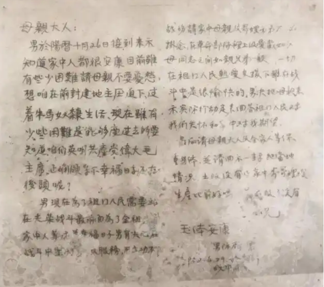 男于10月16日收到来信,知道家里人都很安康,目前我有些小困难,请母亲大人不要忧愁。想咱在前封建地主的压迫下过着牛马奴隶生活,现在有一点小困难是能够受过去的。要知道在英明共产党,伟大毛主席的领导下,幸福的日在还在后头呢。 男现在为了祖国人民,需要站在光荣战斗最前面,为了全祖国人民家中人等过上幸福日子,男有决心在战斗中,为人民服务,不立功不下战场。请家中母亲及哥嫂弟弟不必挂念。在革命部队里上级爱军人如父母,同志之间如亲兄弟一般,一切在祖国人民热爱支援下,在战斗中是很愉快的,男决心用实际行动来回答祖国人民对我们关怀和家中对我期望。
