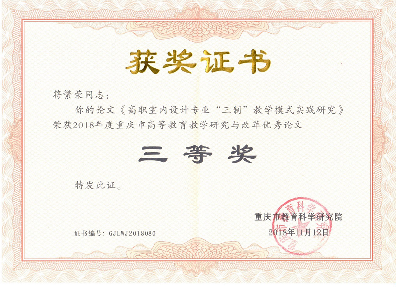 本网讯(文/科技处夏冬梅、大学生记者团)重庆市教育科学院近日发出专门通知,公布2018年度重庆市高等教育教学研究与改革优秀论文征集及评选结果,我校推荐的参评作品,土木工程学院环境设计系主任符繁荣副教授的论文《高职室内设计专业“三制”教学模式实践研究》榜上有名,获得优秀论文三等奖。