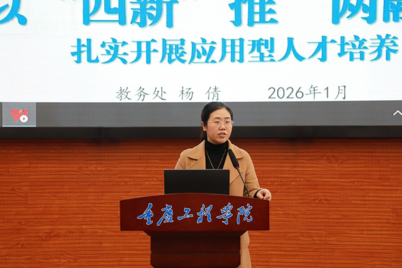 教务处处长杨倩围绕专业建设、年度成果与未来规划汇报。2024年专业监测数据显示,学校专业建设呈梯队化发展态势,部分专业成效突出,少数专业仍有提升空间。2025年教学工作紧扣“两融一改”,以 AI技术融入驱动教学创新,深化产教融合构建协同育人生态,通过制度修订、人才培养方案优化及实践平台搭建推动项目化教学落地,以OBE教学改革落实课堂变革,在课程建设、竞赛获奖等领域实现多项历史性突破。2026年将重点推进项目课程化、课程项目化与成果培育常态化,力争在产教融合课程建设、专业评级提升、AI教学案例开发及人才培养质量优化等方面再上新台阶。