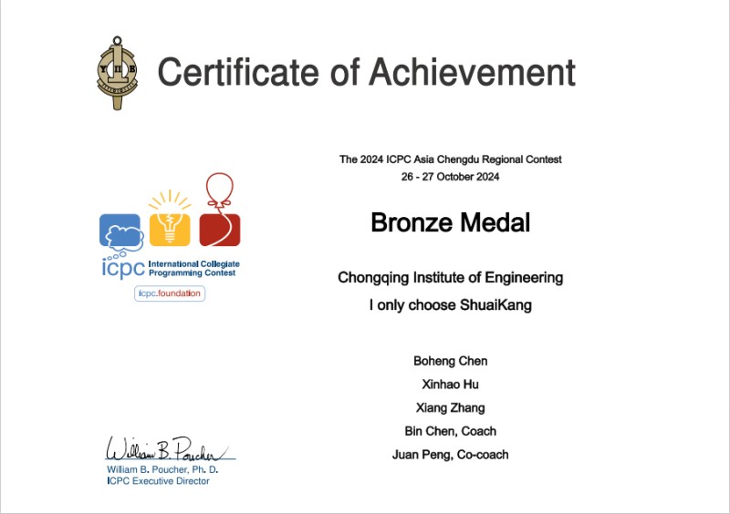对陈博恒而言,各类高水平赛事是检验实践能力的最佳舞台。ICPC 国际大学生程序设计竞赛、全国邀请赛、重庆市大学生程序设计大赛…… 每一场赛事,都是一场与难题的博弈,更是一次实操能力的淬炼。