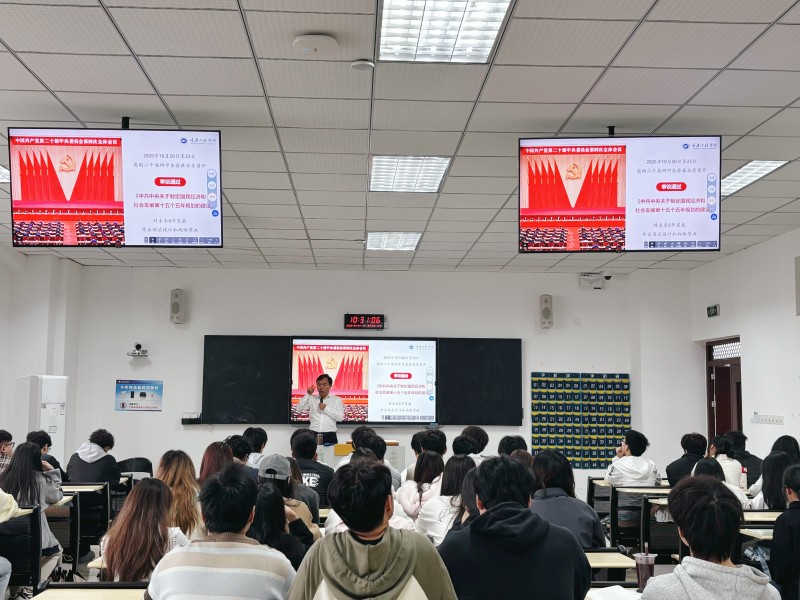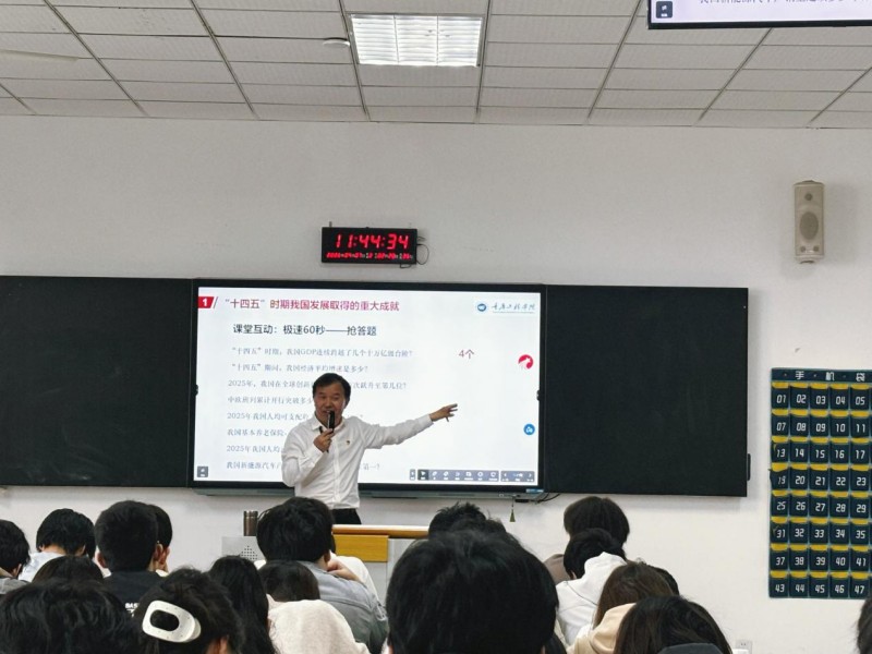 课堂上,唐小勇以“中美铁路对比”为案例,对比美国加州高铁推进缓慢与中国建成全球最大高铁网络的鲜明反差,生动诠释“集中力量办大事”的制度效能,强调坚持党的全面领导、保持战略定力是中国式现代化行稳致远的根本保证。唐小勇勉励在场青年学子,要把个人理想追求融入民族复兴伟大征程,坚定信念、勤学笃行、锤炼本领,以青春之我、奋斗之我,为接续推进中国式现代化贡献重工青年力量。