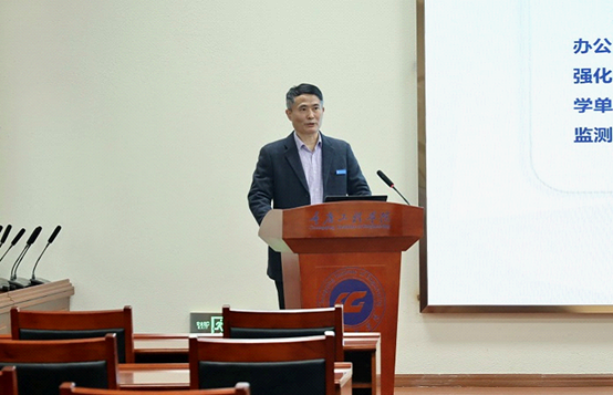 质管办主任赵钰作题为《2022年度教学质量监控工作报告》的主题报告。报告从基本情况、工作成效、存在问题、工作打算四个部分反映了2022年度教学质量监控工作。教学质量管理办公室锚定“高质量一次性通过合格评估”目标,坚持督导与评价并重、监测与评估一体、强化教学运行监控、施行“纵向到底、横向到边”的2+X教学质量保障体系,守住教学“生命线”,发挥“倍增器”的作用。