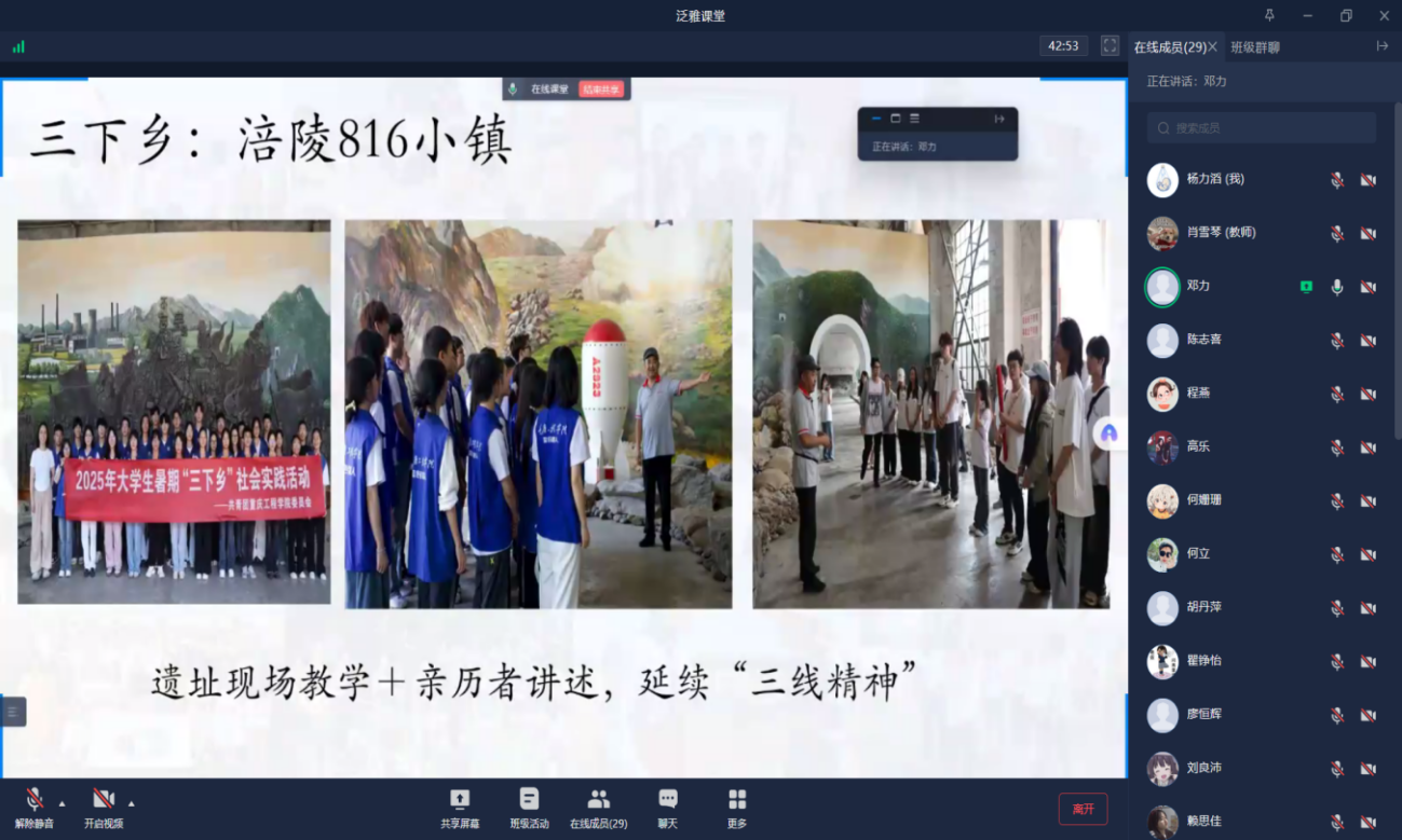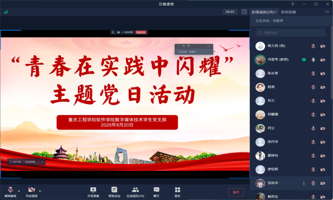 (文/图 软件学院 肖雪琴/杨力滔)为搭建交流思想、分享经验的平台,巩固党员同志们暑假社会实践成果,提升党性修养和实践能力,软件学院数字媒体技术专业学生党支部于2025年8月20日在学习通线上开展了“青春在实践中闪耀”主题党日活动。软件学院数字媒体技术专业学生党支部全体师生党员(含预备党员)参与了此次活动。