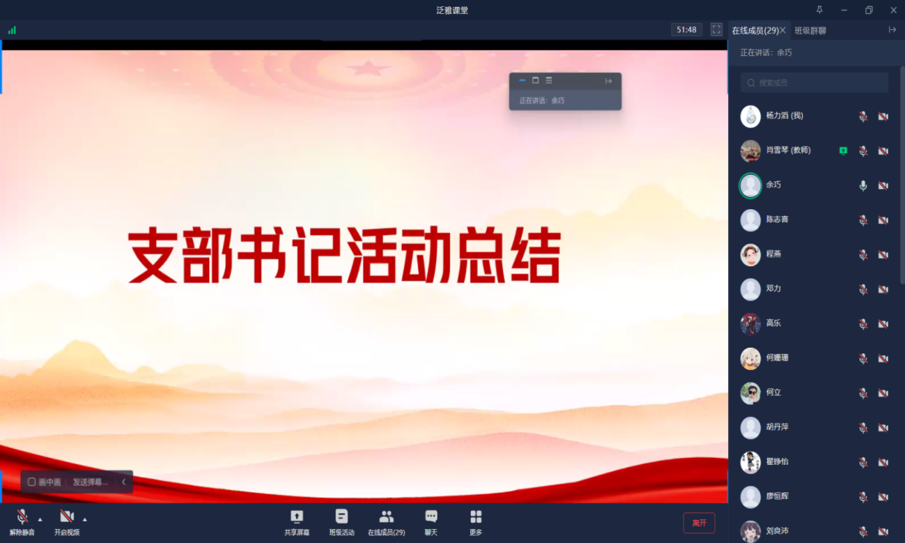 活动伊始,党员代表依次进行暑假社会实践分享。各位党员代表们结合自身经历,从不同角度展现了实践中的收获与感悟:周楠同志投身乡村助教,在克服教学资源有限的挑战中,用课程辅导与兴趣课堂点亮孩子们的求知眼睛,字里行间满是对乡村教育的热忱;肖雪琴同志涉足基层服务与行业调研等多个领域,借助图片素材,生动呈现了运用专业知识解决实际问题的过程,让线上参与的党员们深切体会到实践的多样价值;邓力同志深入基层一线,在乡村志愿服务与政策宣传中,用心学习与群众沟通的技巧,助力解决实际困难,彰显了党员扎根基层、服务群众的担当。