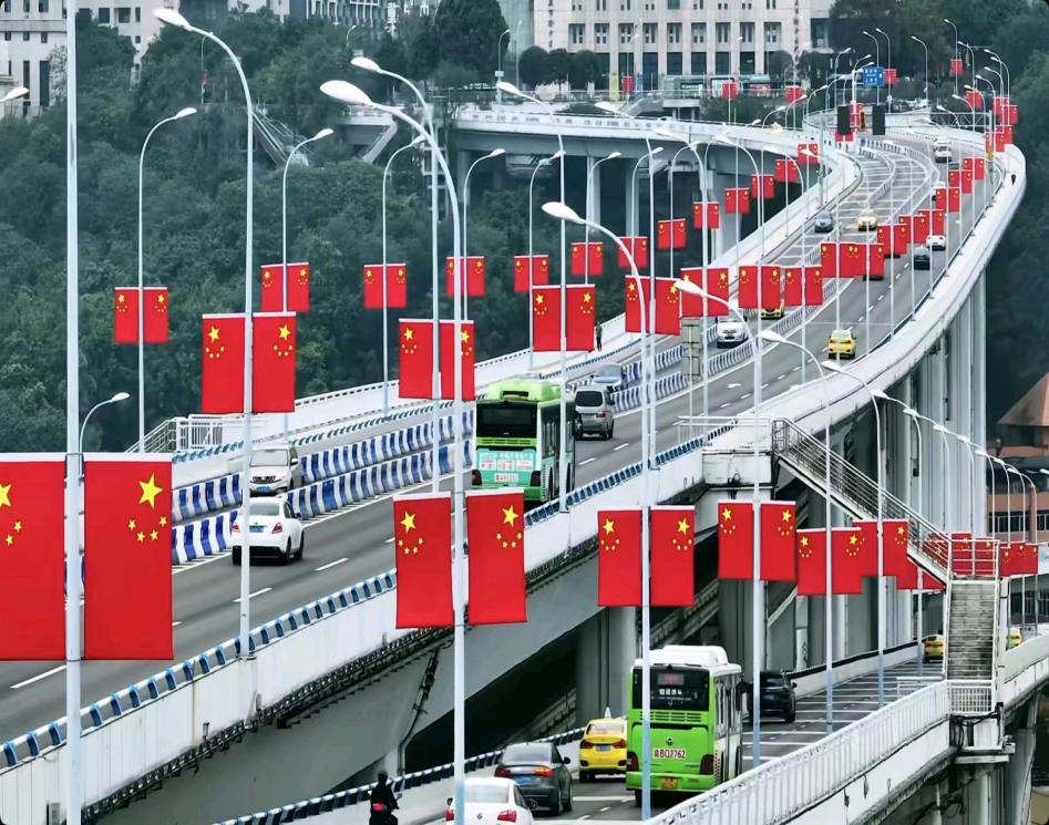 牟芳琳、王露霖和刘思琪的作品均被评为三等奖,密集的中国国旗整齐悬挂,桥下红旗“川流不息”,彰显对祖国的热爱与崇敬,同时展现出对国家的认同感和自豪感。