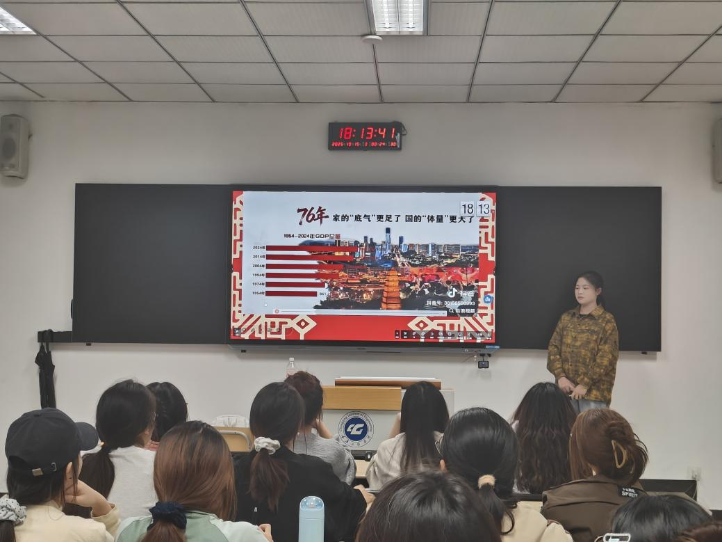 活动伊始,主讲人通过播放新中国成立76周年历程回顾视频,以震撼的影像资料展现了国家从站起来、富起来到强起来的伟大飞跃。视频中一个个历史性瞬间让在场同学深刻感受到中国共产党带领全国人民创造的非凡成就,增强了民族自豪感和历史使命感。