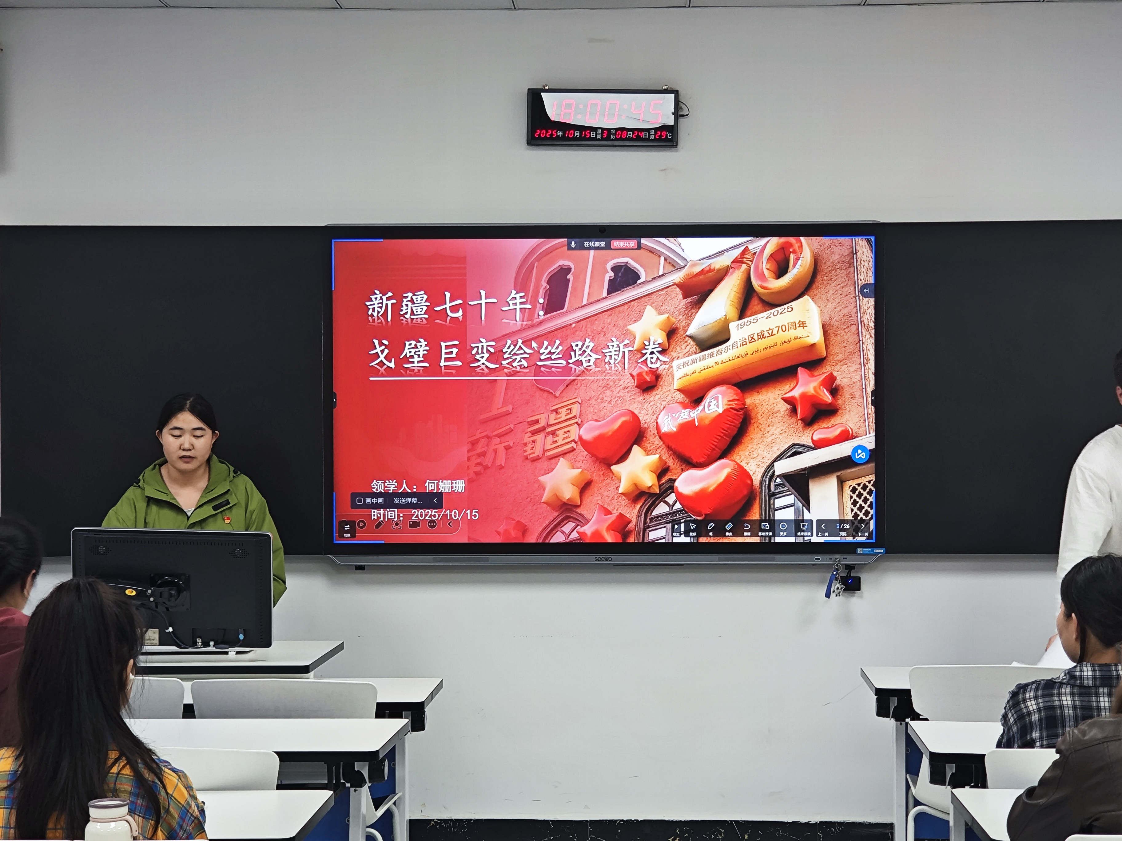 活动伊始,何姗珊同志领学习近平总书记关于新疆工作与爱国主义教育的重要论述,结合实例系统解读新疆七十年来在基础设施、民生改善、民族团结等领域的发展成就。随后,全体成员观看《航拍中国(新疆篇)》,以空中视角直观感受新疆的自然人文风貌与发展实践,深化对党中央治疆方略的理解。知识竞答环节气氛热烈,有效巩固了学习成效。