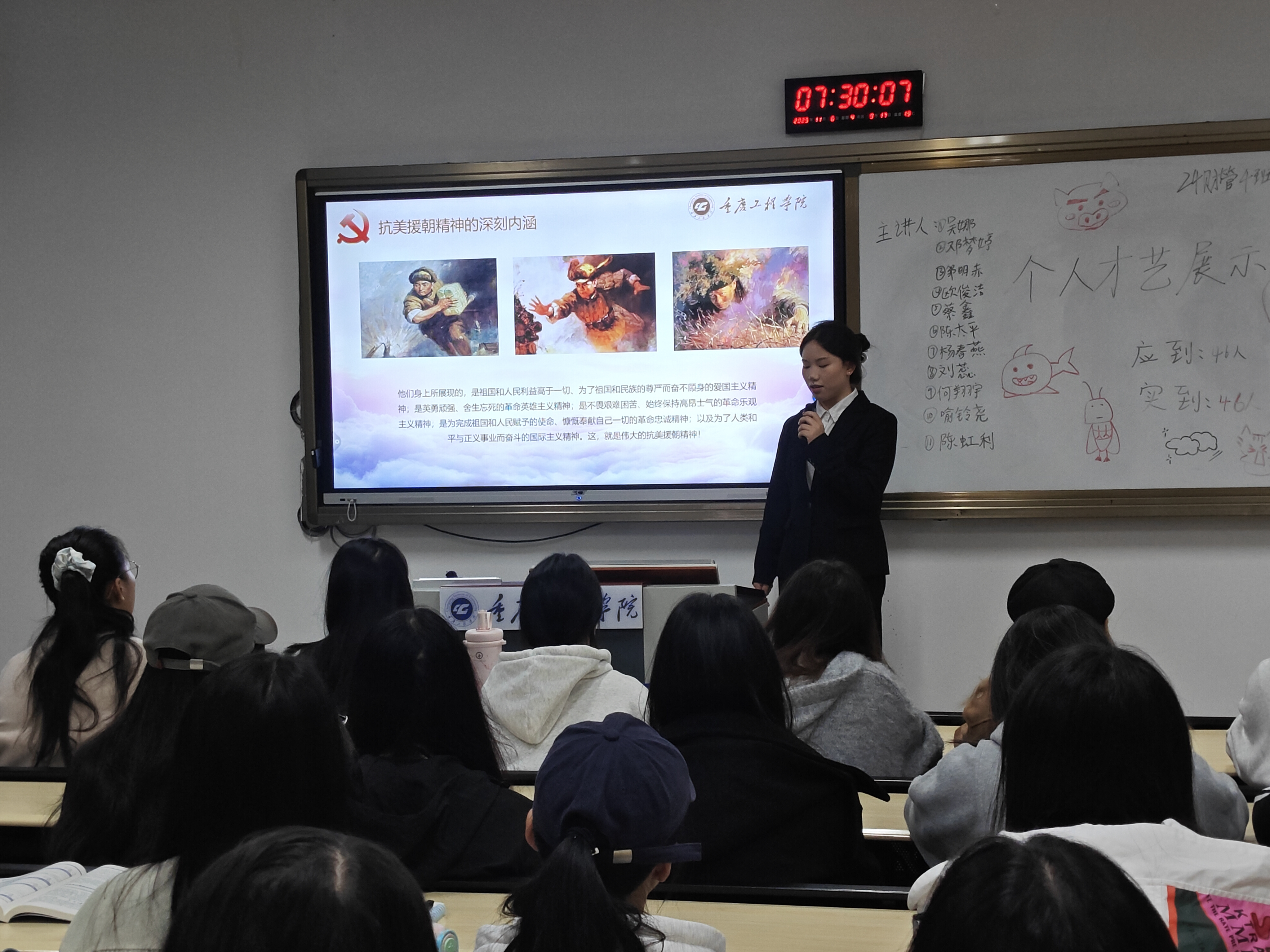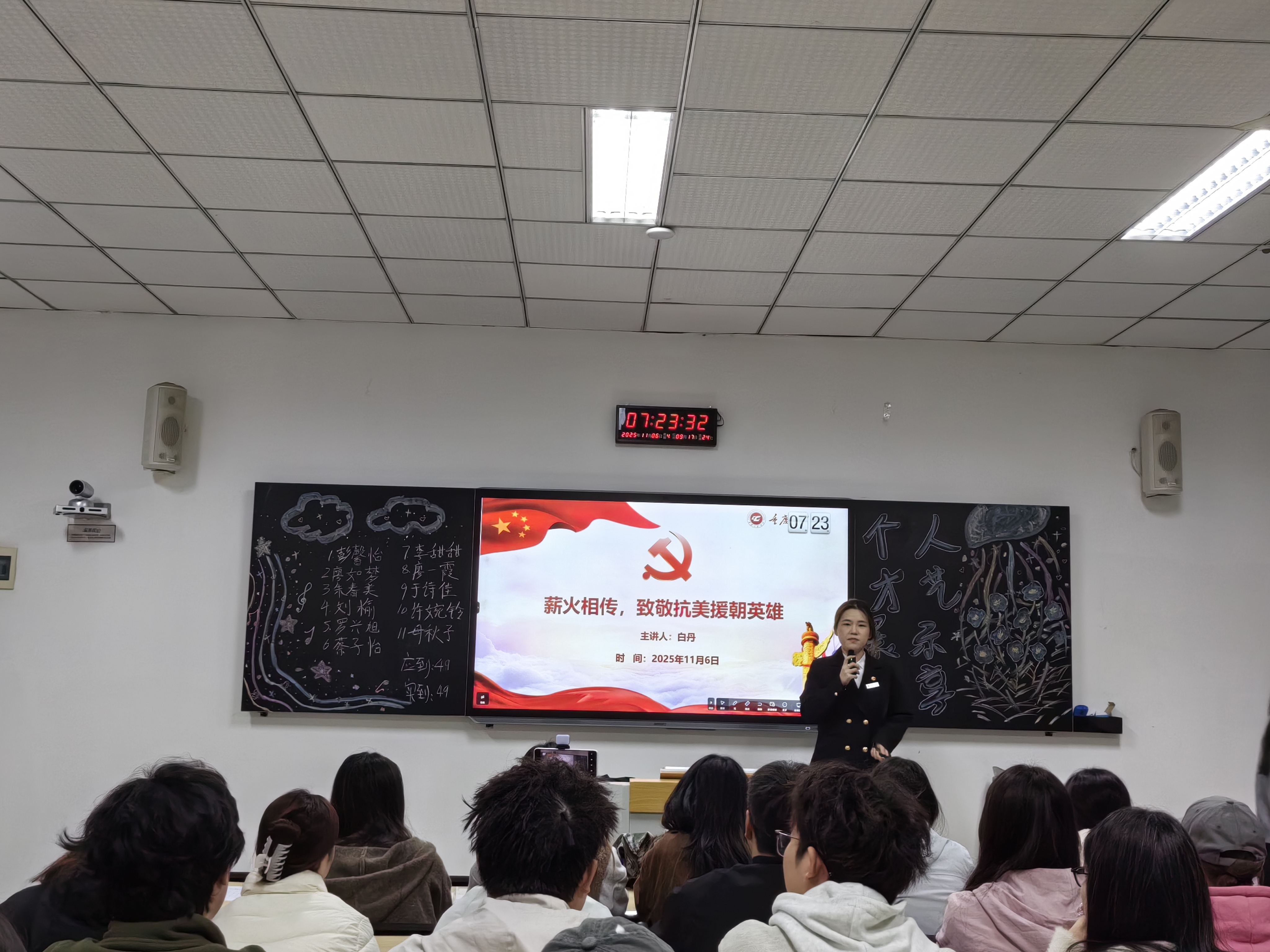 本网讯(图/刘静 文/章鑫 学生党教中心)为致敬英雄,传承红色基因,结合学院七培四创大学生理想信念教育方案,11月6日上午,数字经济与管理学院党总支于第六教学楼有序开展“大学生微党课”进班级主题活动。本次活动由武小晗、周盈盈等八位优秀学生党员以“薪火相传,致敬抗美援朝英雄”为主题展开。