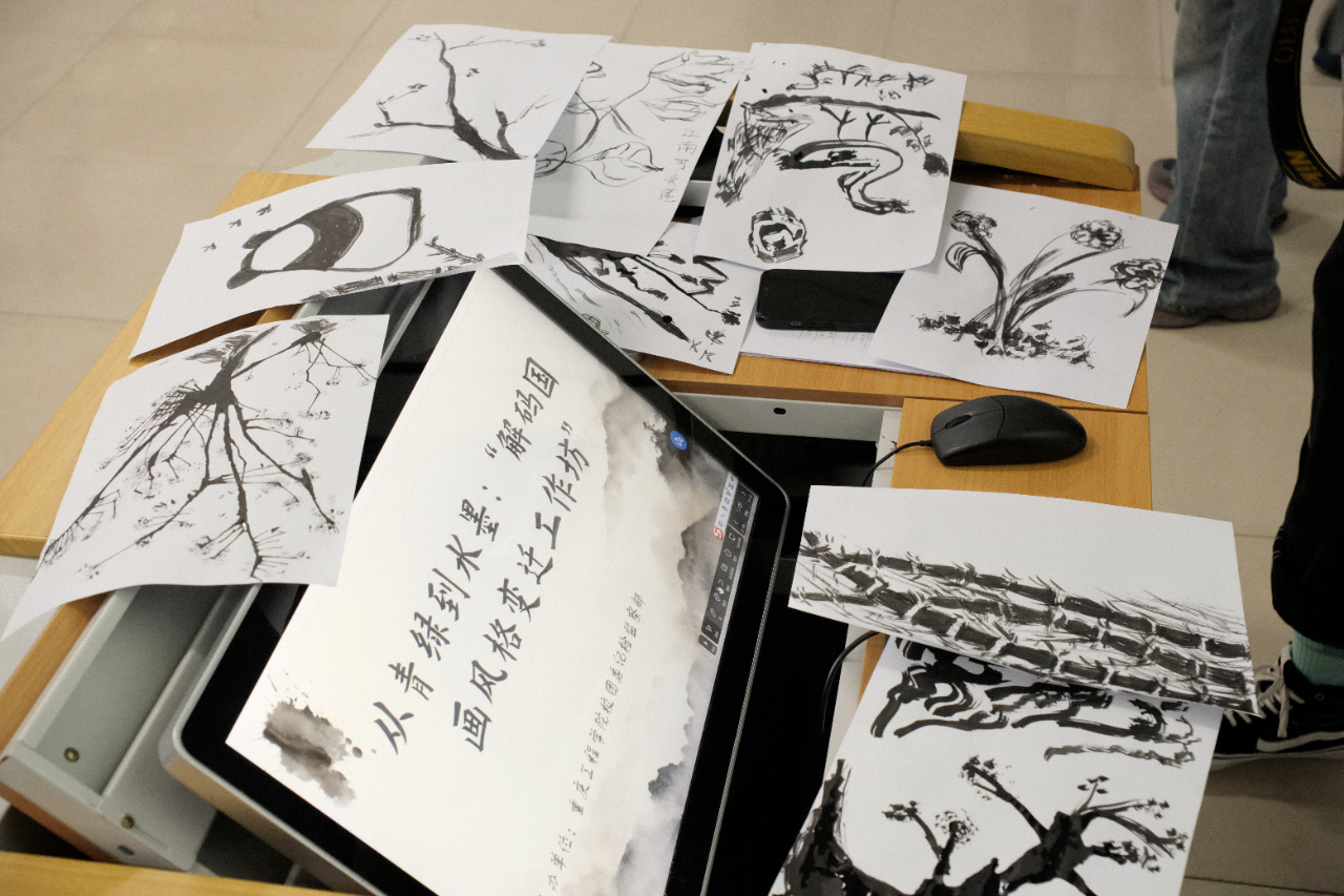 活动分为四个环节。首先通过播放青绿画与水墨画的对比视频,生动展示了两者在用色、技法和审美意境上的鲜明差异;随后进行的专业讲解系统梳理了中国画从唐代青绿山水到宋元水墨意趣的风格演变历程,深入解读了其背后的文化内涵与哲学思想;在实践体验环节,同学们亲手执笔绘制,在笔墨丹青间感受传统艺术的独特韵味;最后分组交流与作品分享将活动推向高潮,大家踊跃发言,畅谈创作心得与艺术感悟。