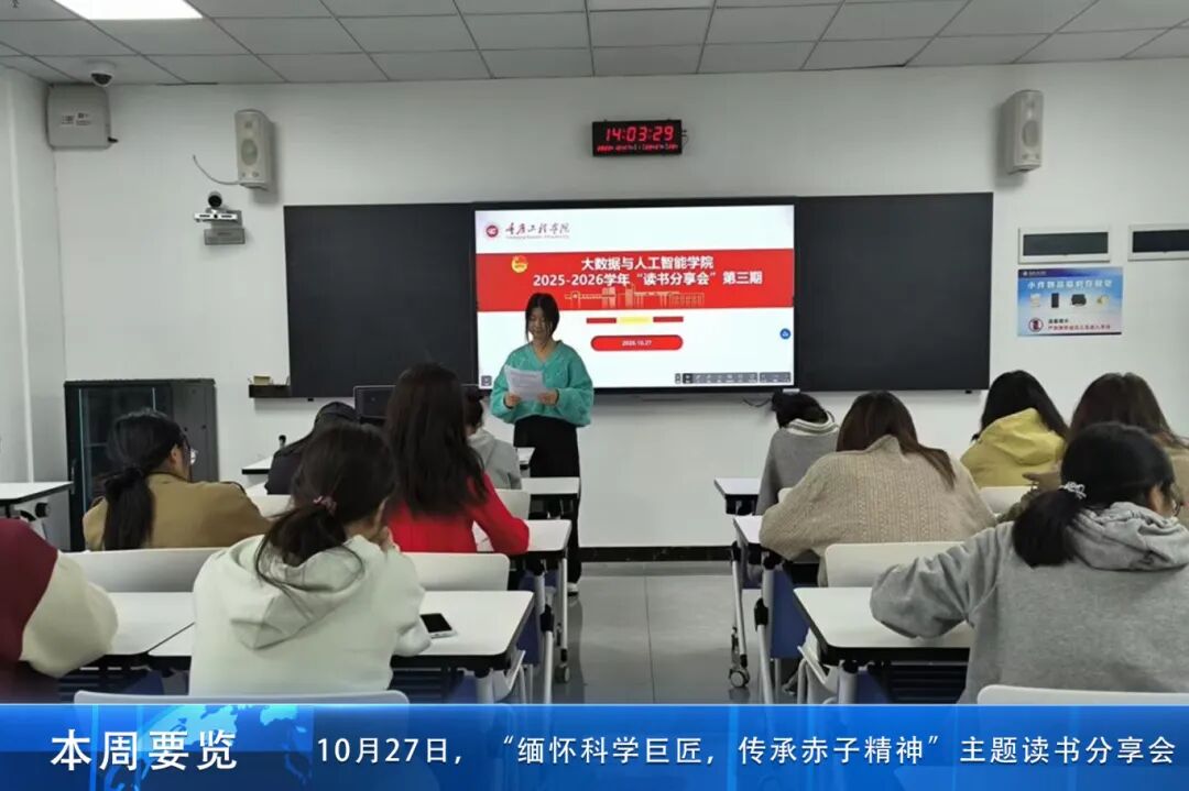 2025年10月27日14:00,大数据与人工智能学院学习部举办“缅怀科学巨匠,传承赤子精神”主题读书分享会。活动向30余名学生生动介绍了杨振宁先生的学术成就与报国情怀,同学们在互动环节踊跃发言,纷纷表示将以先生为榜样,扎实钻研,为科技强国贡献青春力量。
