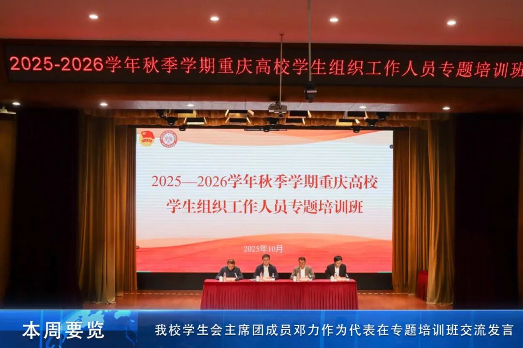 2025年10月31日至11月1日,由团市委、市学联在重庆移通学院举办2025—2026学年秋季学期重庆高校学生组织工作人员专题培训班上,我校学生会主席团成员邓力作为代表,以《深耕服务阵地赋能青春成长》为题进行交流发言,重点分享了“就业扒扒团”、“重工青年说”等“我为同学办实事”项目的创新做法与成效,赢得了现场广泛好评。此次交流充分展示了我校学生工作的良好形象。校学生会将以此为契机,继续聚焦同学需求,做深做实服务项目,引领广大青年在实践奉献中成长成才,为学校发展与重庆建设贡献青春力量。