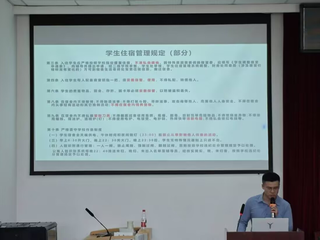 会议伊始,分团委书记张徐宇发表讲话。他对《重庆工程学院学生宿舍管理规定》进行了详细解读,明确了住宿调换的审核流程、宿舍安全禁令、日常作息要求及卫生值日安排,并提醒同学们严格遵守安全纪律,自觉维护寝室环境卫生,积极协调室友之间的关系。会议最后,党总支书记唐和平作总结发言。他重点强调了寝室长在寝室建设中的关键作用,希望各位寝室长以身作则,带动室友共同遵守学校相关规定。唐书记的讲话充分体现了学院对学生寝室安全与卫生工作的高度重视。