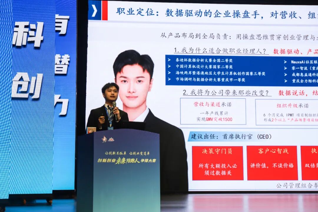 近日,由重庆市委组织部、重庆市委金融委员会办公室、重庆市教育委员会、重庆市科学技术局等单位联合主办的创新创业“未来陪跑人”争锋大赛决赛在重庆工商大学圆满落幕。历经高校选拔推荐、专家资格审核、实战集训淬炼、现场巅峰对决等多轮严苛考核,我校大数据与人工智能学院李杰同学凭借过硬的双创综合素养、扎实的科创实践功底,在众多优秀参赛者中脱颖而出,成功斩获铜奖。