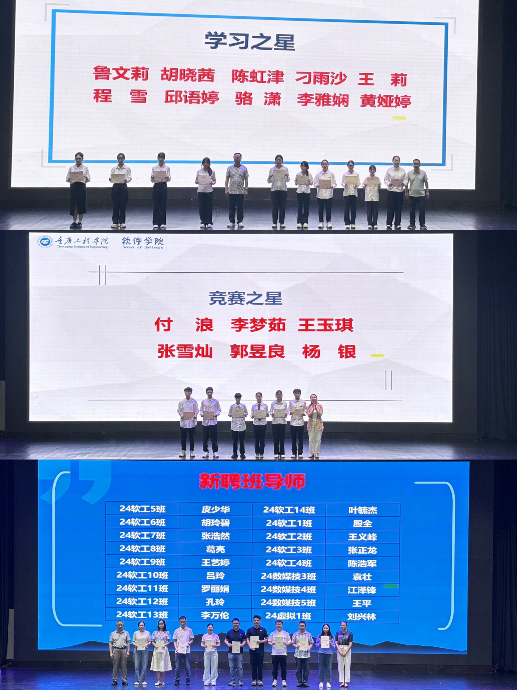 会议伊始,张运老师宣读了2024-2025学年度“学习之星”与“竞赛之星”的表彰决定,对在学业和竞赛领域表现突出的学生予以鼓励紧接着,大会举行了2024级班级专业班导师及思政教师兼职辅导员聘任仪式,软件学院院长周龙福、数字孪生产业学院院长张晓颖为受聘教师颁发聘书接着,2023级学生代表刘欣炆学姐从自我成长、学习方法和态度、时间管理与实践以及健康的心态和身体四个维度,结合自身经历进行了干货满满的分享,为新生提供了可借鉴的大学成长路径。随后,党总支书记刘子菱作学业发展与职业规划指导她以清晰的逻辑和生动的案例,为新生拆解了大学四年的关键成长节点,殷切希望大家能够做好学业规划,主动提升学用转化能力,在专业领域深耕细作,为未来职业发展筑牢根基。最后,院长周龙福发表重要讲话。他呼吁同学们要珍惜生命、学会自我控制,在大学中平衡好学习与生活;同时提倡大家积极融入社会活动,在实践中提升综合能力,主动学习、共同营造优良的学院学习氛围。