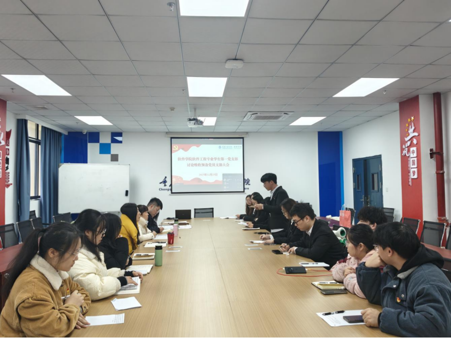 (文/图 软件学院 陈代玉)软件学院软件工程专业学生第一党支部于12月25日在7506会议室召开讨论吸收向海等6位同志为中共预备党员支部大会。会议由支部书记王薇同志主持,全体党员、预备党员共同参加。