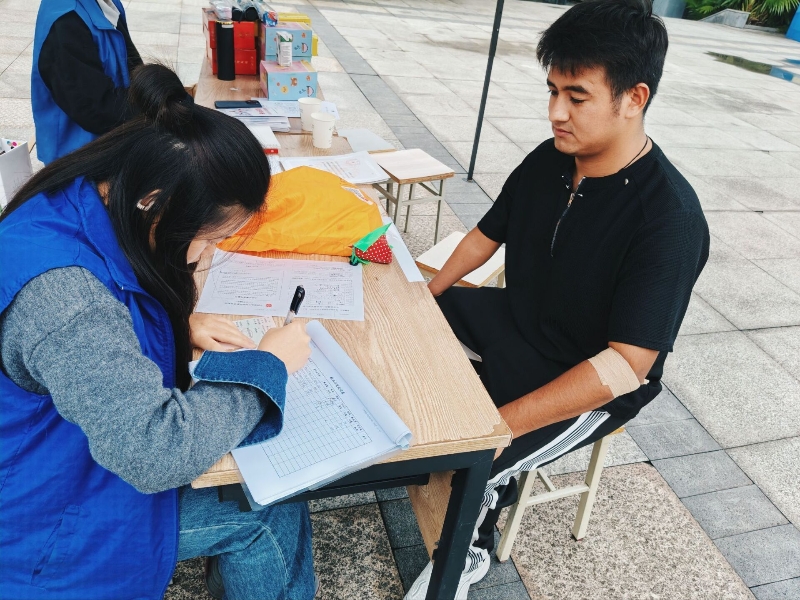 活动现场,大足中心血库工作人员与志愿者分工协作:志愿者引导到场同学分组排队,协助核对身份、填写信息登记表;工作人员依次为献血者完成血压测量、血液初筛等健康检测,合格者进入采血环节。采血后,志愿者及时递上温水、糖水与小点心,提醒术后休息及饮食禁忌。整场活动流程清晰,参与献血的近100名同学以实际行动诠释爱心,在捋袖捐赠中传递生命温度。