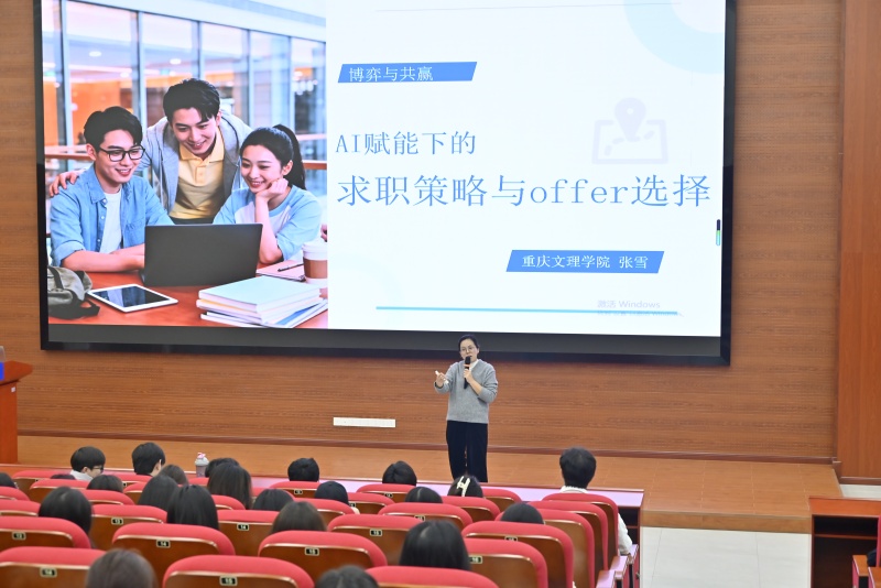 本网讯(文/ 双桥校区管委会 王利 图/ 双桥校区新媒体中心)为积极应对人工智能时代对高校毕业生就业工作带来的新机遇与新挑战,进一步提升我校学生数字化求职竞争力。3月25日下午,由就业指导中心主办的“AI赋能下的求职策略与Offer选择”专题讲座在双桥校区三教报告厅顺利举行。本次讲座特邀重庆文理学院生涯规划与就业指导专家张雪担任主讲嘉宾,校区学生共计200余人到场聆听。