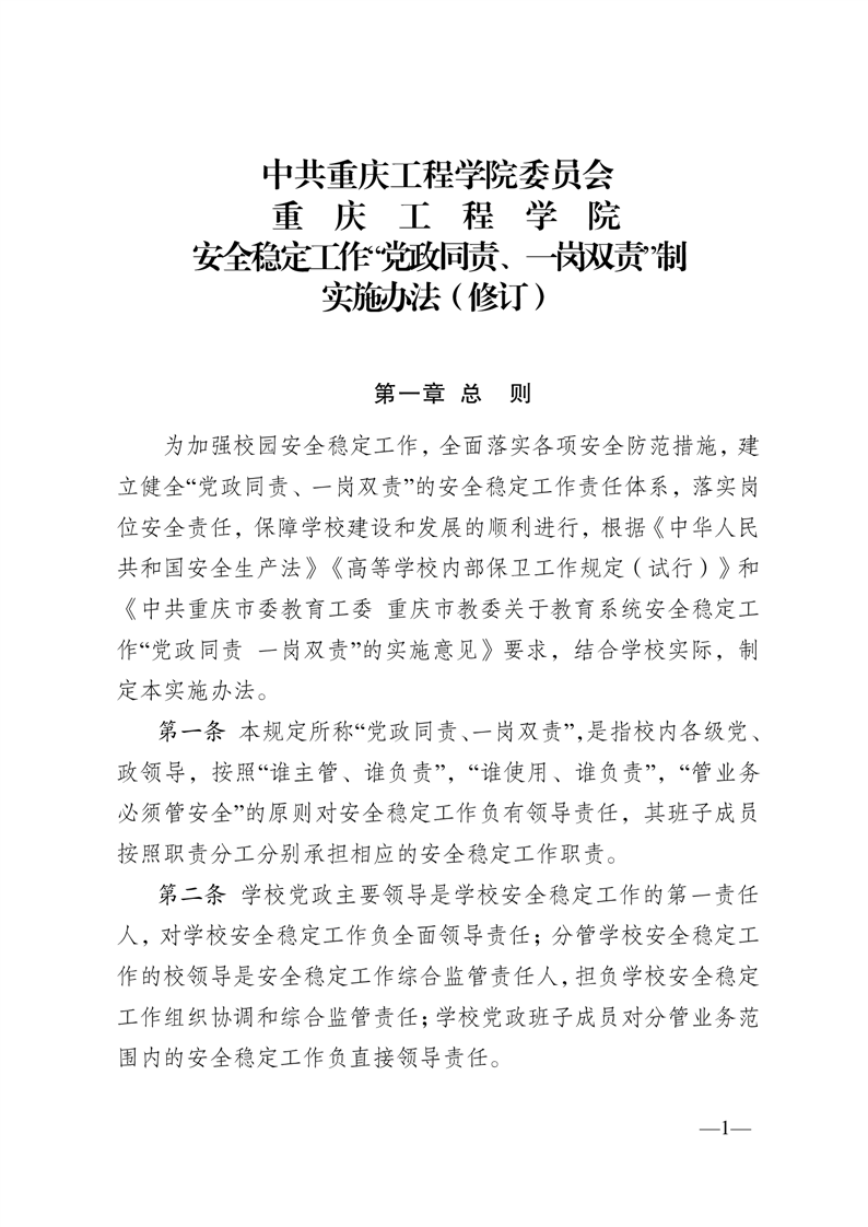 中共重庆工程学院委员会 重庆工程学院安全稳定工作“党政同责、一岗双责”制实施办法(修订)