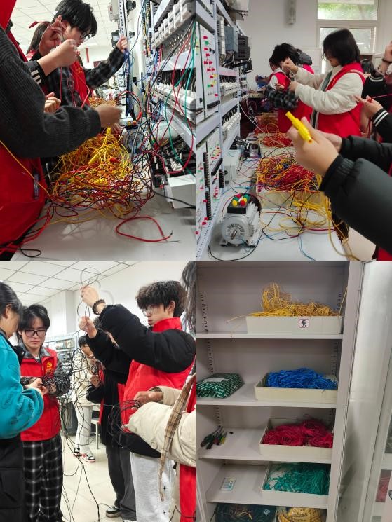 活动开始,全体参与人员在第四教学楼前集合。活动负责人围绕活动整体流程作了明确要求和分工,实验室管理员对器材整理操作规范及现场安全要点作详细的示范。活动现场大家秉持严谨负责的态度,以“分工协作、高效配合”为原则,对实验室各类实验线路逐一进行分类梳理、核对校验与规范摆放——从杂乱缠绕的线路分拣,到不同类型线路的分区归置,每一步都细致入微,最终让原本繁杂的实验线路变得井然有序、清晰可辨。